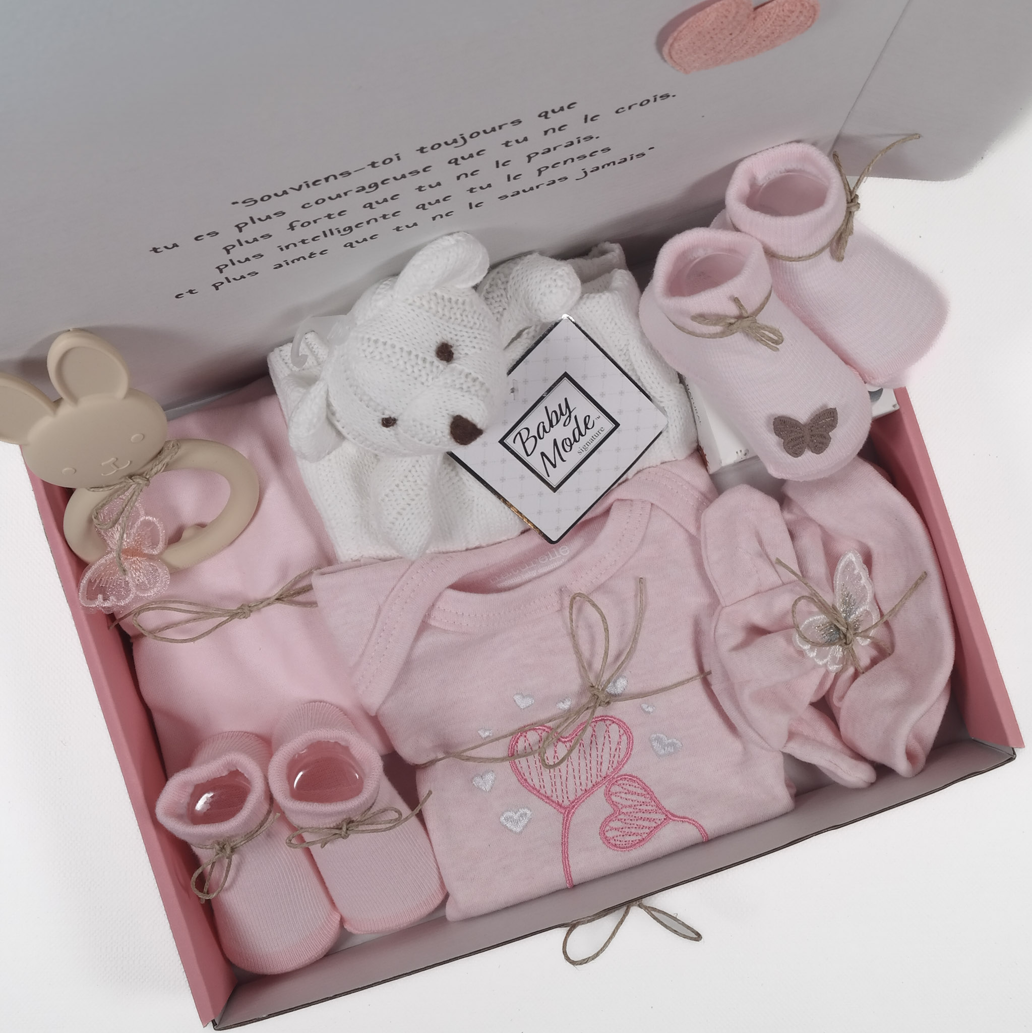 Dieses 10-teilige Babyset wurde entworfen, um Neugeborene von 0 bis 3 Monaten mit Sanftheit, Sorgfalt und Raffinesse zu begleiten. Es enthält eine Auswahl an Kleidungsstücken und Accessoires, die hauptsächlich aus biologischer Baumwolle hergestellt werden, ergänzt durch Elemente zur Förderung und zum Wohlbefinden, die sorgfältig aufgrund ihrer Qualität und Feinheit ausgewählt wurden. Es wird in einer eleganten blauen Wellpappeschachtel präsentiert und ist ein wertvolles, harmonisches und unvergessliches Geschenk.