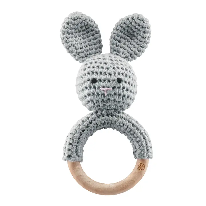 - Eine ökologische Beißrassel Hase MAYLILY grau, handgestrickt aus biologischer Baumwolle und mit einem Ring aus zertifiziertem Ahornholz mit sanftem Rasseln kombiniert. Elegant und sensorisch, beruhigt sie das Zahnen und regt gleichzeitig die Sinne des Babys an, mit einem unverwechselbaren Design, hergestellt in Polen.