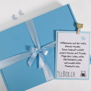 Ce coffret de naissance composé de 10 pièces a été imaginé pour accompagner les nouveau-nés de 0 à 3 mois avec douceur, soin et raffinement. Il réunit une sélection de vêtements et d’accessoires confectionnés principalement en coton biologique, complétés par des éléments d’éveil et de bien-être, soigneusement choisis pour leur qualité et leur délicatesse. Présenté dans une élégante boîte en carton ondulé bleu, il est pensé pour offrir un cadeau à la fois précieux, harmonieux et inoubliable.