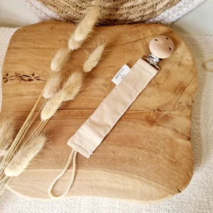 - Un attache-sucette en velours côtelé beige, faite main, avec clip en bois naturel pour fixer facilement la tétine aux vêtements ou au bavoir. Pratique, élégante et douce, elle évite les pertes tout en ajoutant une touche raffinée au quotidien de bébé.