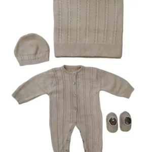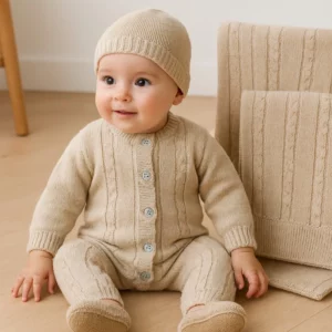 - Une combinaison en maille douce composée de 50 % coton et 50 % modal, pensée pour offrir chaleur, confort et liberté de mouvement. Dotée de boutons sur le devant et à l’entrejambe pour un habillage facile, elle enveloppe bébé avec élégance et délicatesse dès les premiers mois.